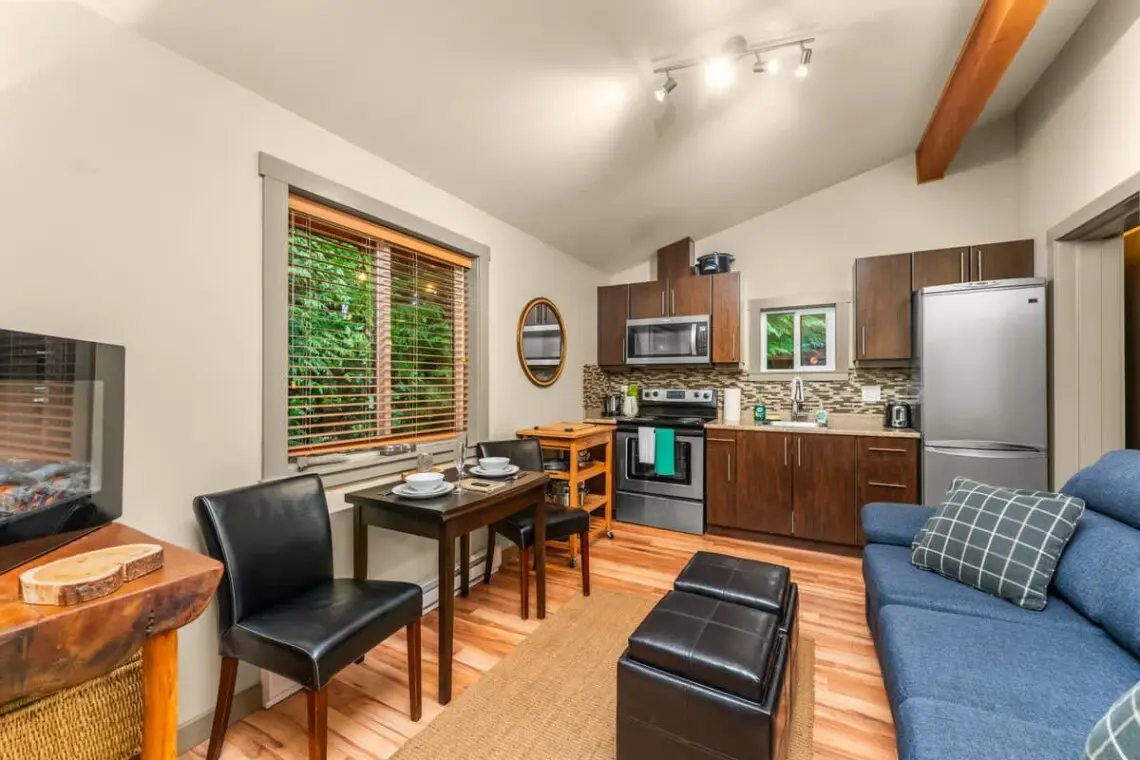 Private cabin located in the Wild Coast Cottages development in Port Renfrew that sleeps 2 comfortably in the main cabin and 2 more in the detached bunkhouse, all on queen-sized beds. An open living space with exposed beams, equipped kitchen, full bath, WIFI, gas BBQ, wood-burning fire pit, and cozy wraparound deck, bring all the comforts of home with a touch of rustic escape. Walking distance to restaurants, cafes, marinas, and remote beaches, let this be a haven for your escape. Pet Friendly.