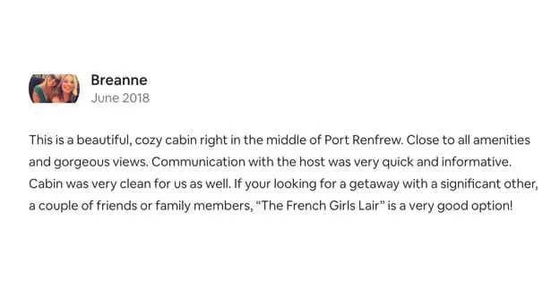 ➞ A real gem in the heart of Port Renfrew. The perfect place to escape the city, or unwind and relax after a day of adventure!